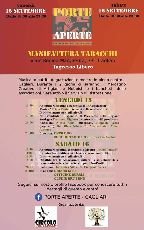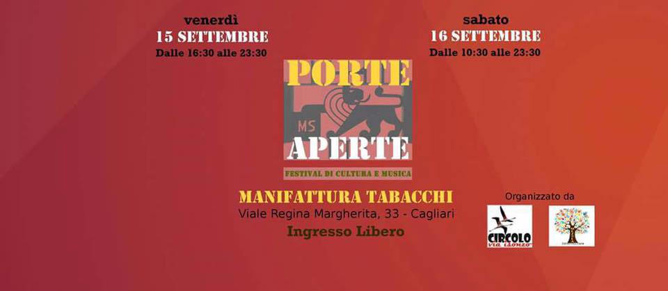 PORTE APERTE- FESTIVAL DI CULTURA E MUSICA – MANIFATTURE TABACCHI – CAGLIARI – 15-16 SETTEMBRE 2017 Reviewed by admin on . Porte Aperte, Festival di cultura e musica Cagliari , 15-16 settembre 2017 Manifattura Tabacchi Viale Regina Margherita 33 Musica, cultura, dibattiti, degustazi Porte Aperte, Festival di cultura e musica Cagliari , 15-16 settembre 2017 Manifattura Tabacchi Viale Regina Margherita 33 Musica, cultura, dibattiti, degustazi Rating: 0