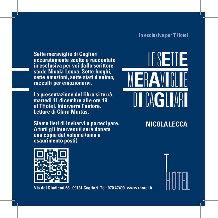 Dopo il successo ottenuto dai racconti su Cagliari scritti in esclusiva per il Thotel da Dacia Maraini, Sandro Veronesi, Marcello Fois, Piera degli Esposti e altri importanti scrittori italiani, siamo lieti di annunciare la pubblicazione dell’opera “LE SETTE MERAVIGLIE DI CAGLIARI” ideata da Nicola Lecca, uno degli autori sardi più amati in Italia e più tradotti all’estero: un vero girovago, un appassionato esploratore che, finalmente, per la primissima volta, scrive della sua città natale, raccontandola attraverso sette luoghi, sette stati d’animo, sette emozioni raccolte in questo piccolo ma prezioso volumetto, con l’intento di regalarvi un punto di vista privilegiato: i fenicotteri, il sole, la lontananza, il “Ritratto di Ines” di Umberto Boccioni, il mercato di San Benedetto, l’ultimo concerto di Carlos Kleiber e il mare.