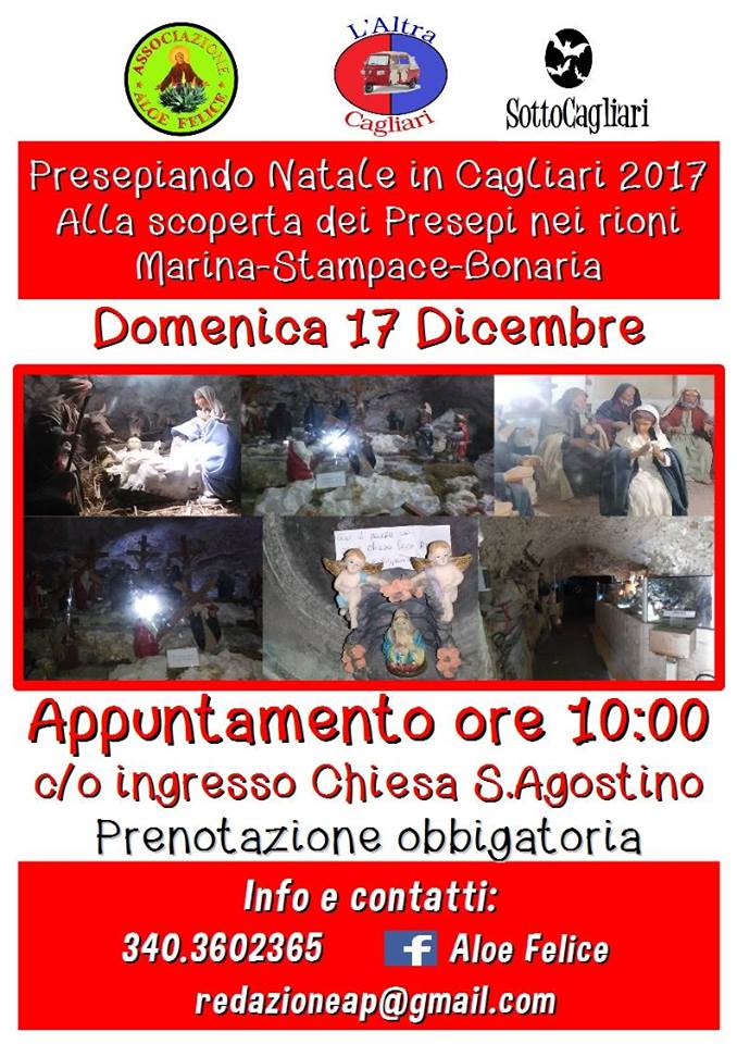 Domenica. 17 dicembre 2017, andiamo a visitare il presepio di Sant’Agostino, di San Michele, di Bonaria, nonché rendere omaggio alla tomba di Fra Lorenzo, inventore del presepio di Sant’Ignazio. Raduno alle ore 10, fronte chiesa SANT’AGOSTINO, largo Carlo Felice. Contributo: 5 euro. PRENOTAZIONE OBBLIGATORIA TELEFONICA: 340 360.23.65_