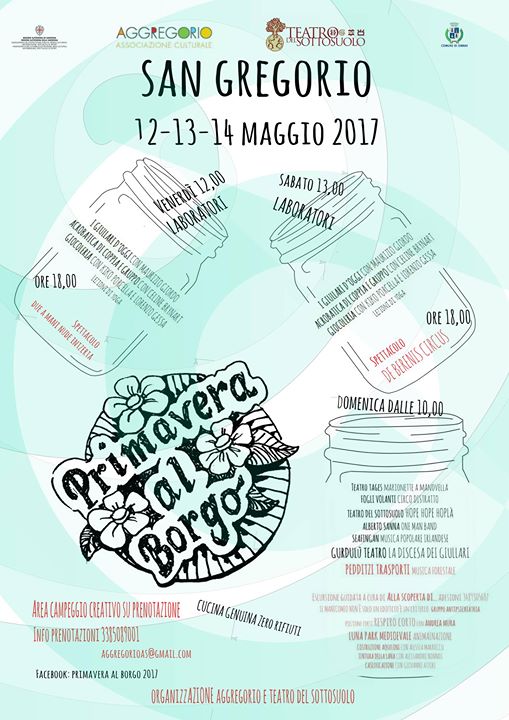 PRIMAVERA AL BORGO – SAN GREGORIO – 12-13-14 MAGGIO 2017 Reviewed by admin on . Tre giorni di spettacoli, natura e musica al Borgo di San Gregorio, Sinnai. Spettacoli, giocoleria, laboratori per grandi e bambini, escursioni e area campeggio Tre giorni di spettacoli, natura e musica al Borgo di San Gregorio, Sinnai. Spettacoli, giocoleria, laboratori per grandi e bambini, escursioni e area campeggio Rating: 0