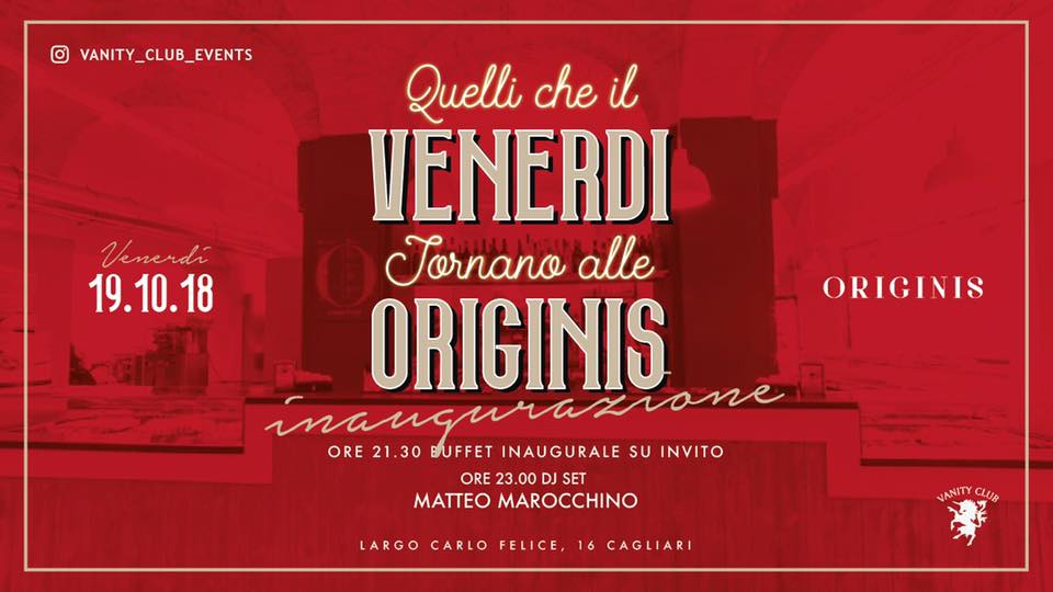 Gentili amici ma sopratutto amiche, siamo lieti d’invitarvi all’INAUGURAZIONE del nuovo pre-serata: *Quelli che il VENERDÌ tornano alle ORIGINIs*. il bellissimo locale situato a Cagliari nel largo Carlo Felice (il locale per il venerdì notte verrà adibito a Club).