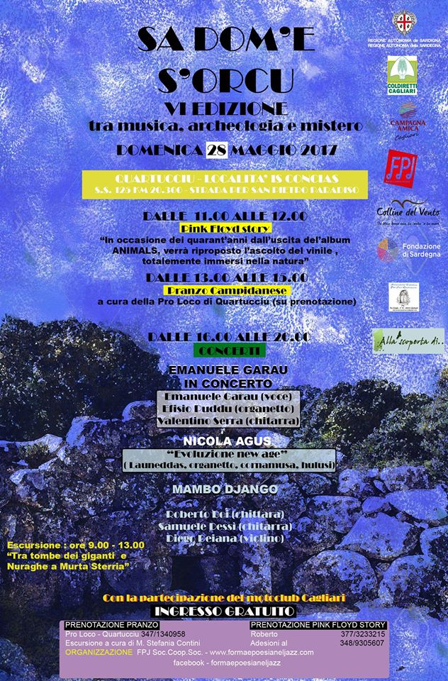 Giunti alla VI edizione, una giornata ricca di attività , tra musica, escursioni e folklore ( anche culinario). con la collaborazione della Pro Loco di Quartucciu, che si occupera del tipico pranzo alla “Campidanese”. La giornata ,per chi volesse, inizierà con una bellissima escursione tra la Tomba dei Giganti e il Nuraghe ” a Murta Sterria” presentata e curata da Stefania Contini. Per gli amanti della vera musica,invece, ” THE PINK FLOYD STORY” vi farà viaggiare a ritroso nel 1977, quando i quattro geni di Cambridge incisero “ANIMALS”, quale occasione, quindi, per ascoltarlo in Vinile, immersi nella Natura? Dopo una bella pausa rilassante, per dedicarsi ad un buon pranzo ” A sa Campidanesa” e per stare in compagnia anche dell’ormai mitico Motoclub di Cagliari, alle 16.00 si darà “via alle danze” accompagnati da Emanuele Garau, seguito poi da Nicola Agus con i suoi strumenti Sardi e non solo, per poi concludere con la musica dei MAMBO DJANGO”.