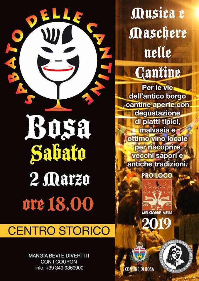 SABATO DELLE CANTINE – BOSA – SABATO 2 MARZO 2019 Reviewed by admin on . SABATO DELLE CANTINE - SABATO 2 MARZO 2019 Vi aspettiamo, rigorosamente MASCHERATI, dalle 18:00 per le vie del nostro bellissimo borgo! Cantine aperte con degus SABATO DELLE CANTINE - SABATO 2 MARZO 2019 Vi aspettiamo, rigorosamente MASCHERATI, dalle 18:00 per le vie del nostro bellissimo borgo! Cantine aperte con degus Rating: 0