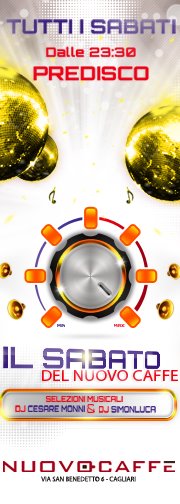 “sabato 19 gennaio ” in una location veramente di classe superiore…il SABATO AL NUOVO CAFFE’ (dalle h.22:30)ci diamo appuntamento per il nuovo PREDISCO di Cagliari!!…un servizio di prim ordine e con le musiche sapientemente miscelate dagli esperti DJ’S CESARE MONNI & SIMONLUCA ma anche con la compagnia giusta e degli ottimi cocktail vi faranno finalmente apprezzare il vero gusto del “SABATO NOTTE”….