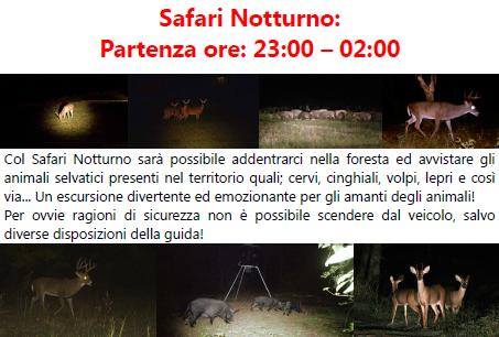 A partire dal 1 Agosto 2014 sarà operativo anche il Safari Notturno! dove a bordo di una jeep ci addentreremo nella foresta alla ricerca degli animali selvatici presenti nel territorio, quali; cervi, cinghiali, volpi, lepri, fagiani e così via…