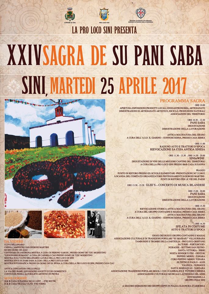 Il 25 aprile si svolge a Sini una importante festa dedicata al tipico dolce locale, su pani saba, un pane a base di mosto cotto, per la guarnizione del quale si utilizzano le mandorle, l’uva passa e spezie varie.