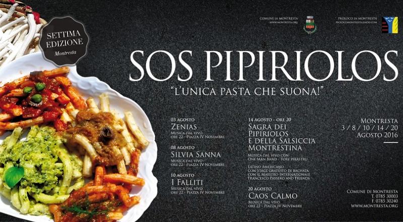 Sos Pipiriolos, sono un tipico tipo di pasta di Montresta, e vengono preparati seguendo l’antica ricetta. Solitamente venivano conditi con un sugo d’agnello (o di cinghiale) e pecorino. Viene chiamata anche “pasta che suona”, in quanto la sua forma ricorda quella di un piffero di canna. Questo tipo di pasta è per i montrestini la pasta della festa, cucinata nelle occasioni importanti.Â