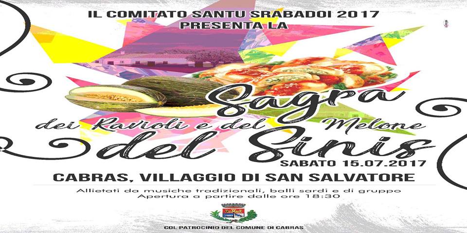 SAGRA DEI RAVIOLI E DEL MELONE DEL SINIS – VILLAGGIO DI SAN SALVATORE – CABRAS – SABATO 15 LUGLIO 2017 Reviewed by admin on . Il Comitato di San Salvatore 2017, con il patrocinio del Comune di Cabras, organizza sabato 15 luglio la Sagra dei Ravioli e del Melone del Sinis nel villaggio Il Comitato di San Salvatore 2017, con il patrocinio del Comune di Cabras, organizza sabato 15 luglio la Sagra dei Ravioli e del Melone del Sinis nel villaggio Rating: 0