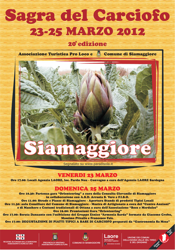 SAGRA DEL CARCIOFO – SIAMAGGIORE- DOMENICA 16 MARZOARTICHOKE FESTIVAL – SIAMAGGIORE – SUNDAY MARCH 16 Reviewed by admin on . La Sagra del Carciofo, ormai alla 21° edizione, è organizzata dall'Amministrazione Comunale in collaborazione con la locale Associazione Turistica Pro Loco di S La Sagra del Carciofo, ormai alla 21° edizione, è organizzata dall'Amministrazione Comunale in collaborazione con la locale Associazione Turistica Pro Loco di S Rating: