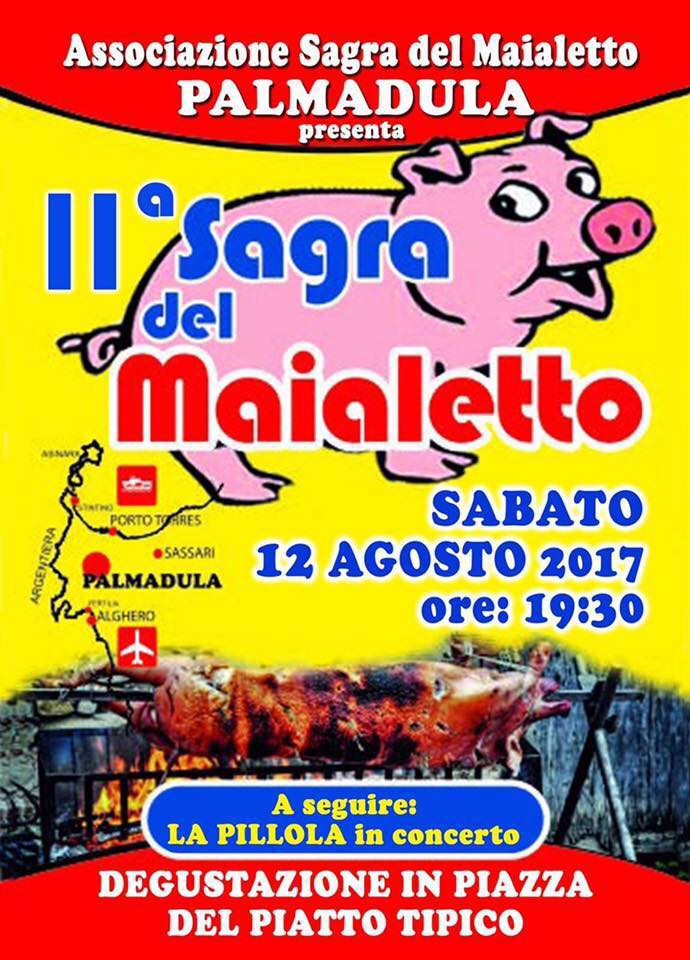 PALMADULAsi svolgerà sabato 12 agosto 2017 nella borgata di Palmadula nella Nurra, a metà strada tra Alghero e Sassari, l’undicesima edizione della “Sagra del maialetto“, con inizio alle ore 19,30 delle degustazioni in piazza. La serata sarà allietata dalla musica dei La Pillola.