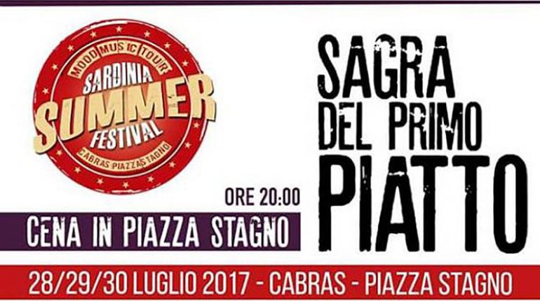 Sagra del Primo Piatto” a Cabras, che si inserisce all’interno del “Sardinia Summer Festival” che si svolgerà in piazza Stagno il 28, 29 e 30 luglio 2017 tra musica, aperitivi, festa della birra e cene di piazza. Quanto alla “Sagra del Primo Piatto” sono previsti 3 menù diversi per ogni serata, preparati con i prodotti tipici del territorio: venerdì pennette con bottarga, rucola e pomodorino fresco; sabato riso freddo ermes e riso venere “Il Ferrari” al profumo di mare; domenica malloreddus al ragù di muggine affumicato e verdure estive. Il menù viene sempre completato da gamberoni arrosto e pane. L’ingresso all’area della festa e dei concerti è ad offerta.