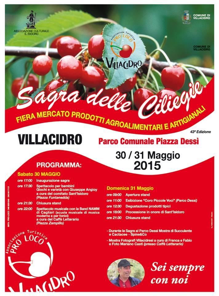 SAGRA DELLE CILIEGIE – VILLACIDRO – 30-31 MAGGIO 2015 Reviewed by admin on . Programma completo della Sagra delle ciliegie di Villacidro:  Sabato, 30 maggio 2015: ore 17,00 – Inaugurazione sagra e apertura stands espositivi ore 17,30 – P Programma completo della Sagra delle ciliegie di Villacidro:  Sabato, 30 maggio 2015: ore 17,00 – Inaugurazione sagra e apertura stands espositivi ore 17,30 – P Rating: 0