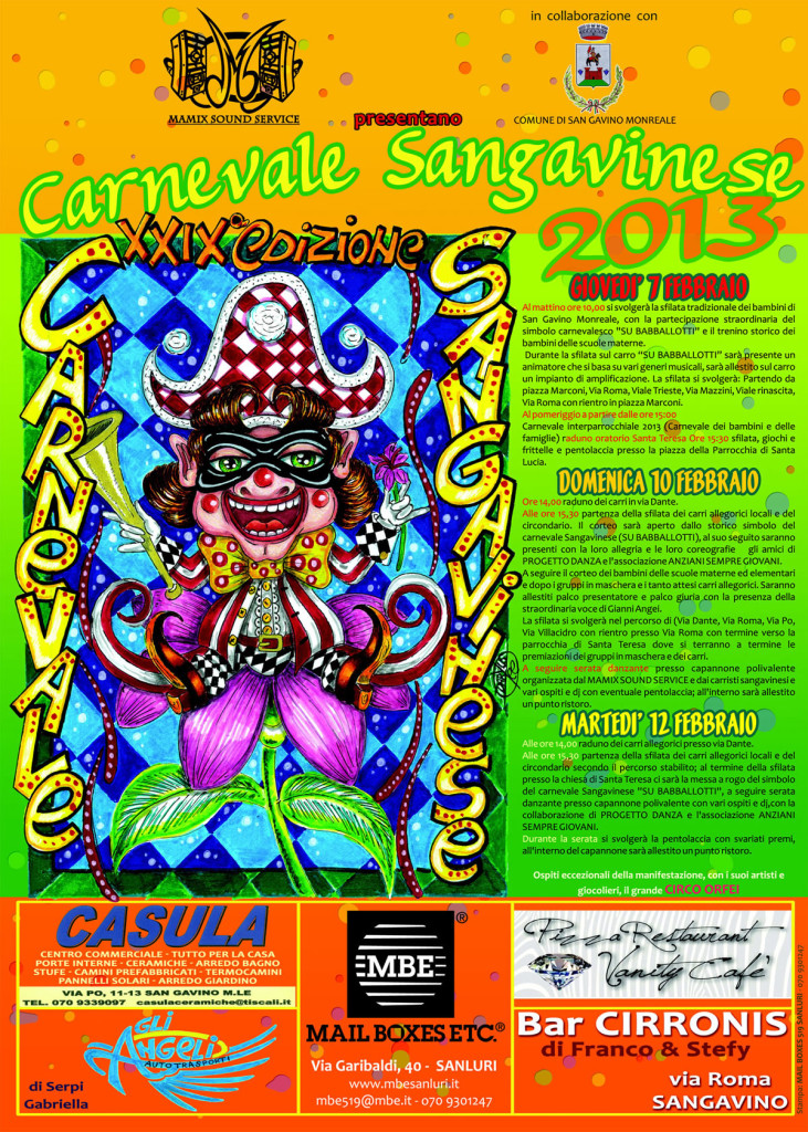 Alle ore 14,00 raduno dei carri allegorici presso via Dante. Alle ore 15,30 partenza della sfilata dei carri allegorici locali e del circondario secondo il percorso stabilito; al termine della sfilata presso la chiesa di Santa Teresa ci sarà la messa a rogo del simbolo del carnevale Sangavinese ”SU BABBALLOTTI”, a seguire serata danzante presso capannone polivalente con vari ospiti e dj,con la collaborazione di PROGETTO DANZA e l’associazione ANZIANI SEMPRE GIOVANI.