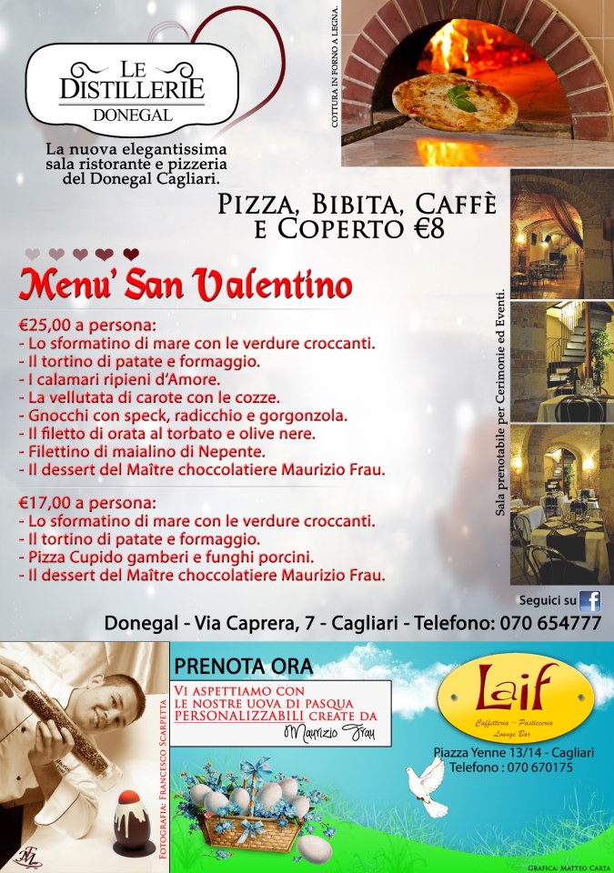 SAN VALENTINO ALLE DISTILLERIE – DONEGAL – CAGLIARI – GIOVEDI 14 FEBBRAIOVALENTINE’S DAY IN THE DISTILLERIE – DONEGAL – CAGLIARI – THURSDAY FEBRUARY 14 Reviewed by admin on . SPECIALE MENU S.VALENTINO ALLE DISTILLERIE DEL DONEGAL ORE 21 PRENOTAZIONI 070/654777 Valentine's Day SPECIAL MENU FOR DISTILLERY OF DONEGAL 21 HOURS RESERVATIO SPECIALE MENU S.VALENTINO ALLE DISTILLERIE DEL DONEGAL ORE 21 PRENOTAZIONI 070/654777 Valentine's Day SPECIAL MENU FOR DISTILLERY OF DONEGAL 21 HOURS RESERVATIO Rating: