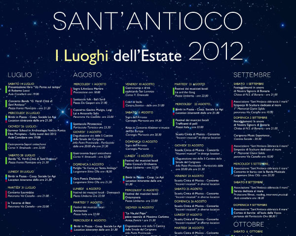 Ecco a voi il cartellone di tutti gli eventi e spettacoli in programma per l’ estate 2012 nella bella cittadina sulcitana situata sull’omonima isola.