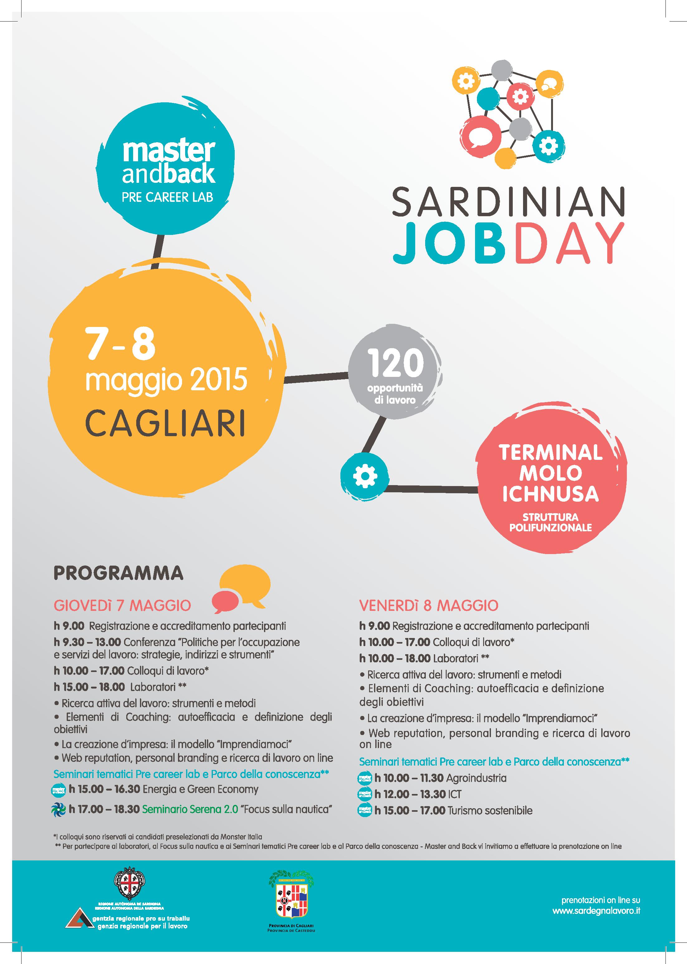 Il 7 e 8 maggio si terrà a Cagliari, presso gli spazi della struttura polifunzionale “Terminal Ichnusa” (Molo Ichnusa) il “Sardinian Job Day” (SJD) un evento dedicato completamente al lavoro, durante il quale svolgeranno attività di incontro fra domanda e offerta di lavoro, si parlerà di politiche attive e servizi per il lavoro, si potranno frequentare laboratori che aiutano ad acquisire maggiori competenze e efficacia nella ricerca del lavoro.