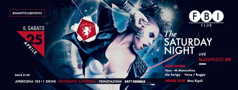 Il Saturday Night è una serata creata dal nostro gruppo organizzativo VANITY CLUB per un pubblico esigente che desidera trascorrere una serata piacevole.