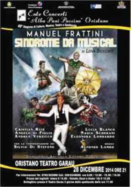 Domenica 28 dicembre presso il Teatro “A. Garau” di Oristano alle ore 21.00, nell’ ambito della 40ª Stagione Concertistica 2014 dell’Ente Concerti “Alba Pani Passino” si terrà lo spettacolo “Sindrome da Musical” con Manuel Frattini, già protagonista di acclamati spettacoli come “Pinocchio”, “Sette spose per sette fratelli”, “Aladin” e “Peter Pan”, che in questo spettacolo interpreta se stesso mentre, con autoironia e con l’aiuto di una psicologa, cerca di guarire dalla sua ossessione per il musical.