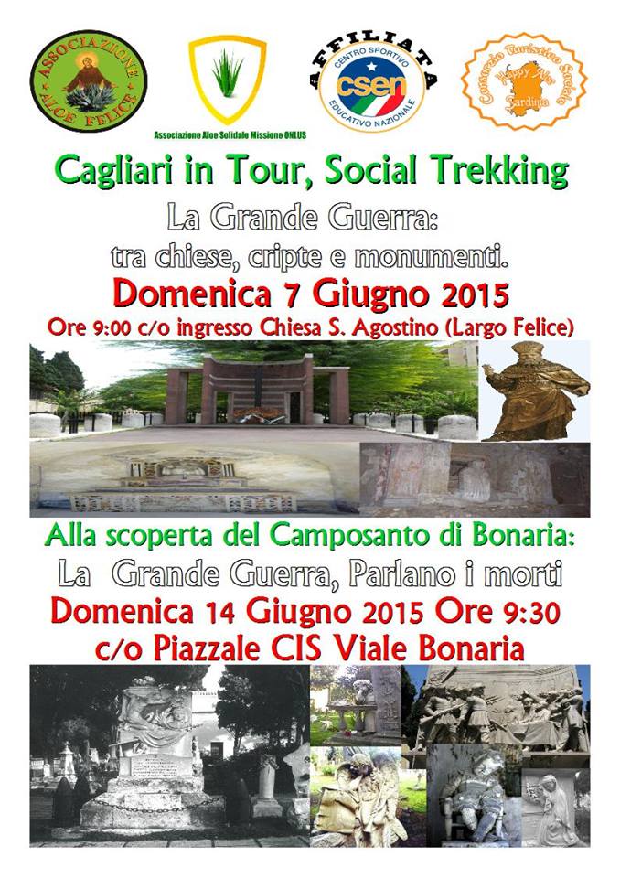 Le associazioni Aloe Felice e Aloe Solidale affiliati al CSEN in collaborazione con il CTS. Happy Aloe Sardinia, organizza domenica 7 giugno 2015, un social trekking urbano, alla scoperta delle tracce e simboli, della “GRANDE GUERRA”, nei quartieri storici di Cagliari, tra mostre, chiese, cripte sotterranee, monumenti, sacrari, aneddoti e allumingiusu cagliaritani.