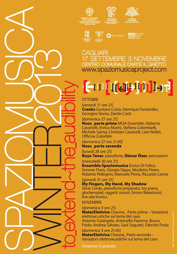 Il concerto di Ruya Taner e Dincer Özer apre una settimana densa di impegni per la rassegna autunnale di Spaziomusica che nel prossimo appuntamento, mercoledì 30 ottobre (sempre al Ghetto con inizio alle 21), vivrà uno dei suoi momenti più originali e rappresentativi: l’Ensemble Spaziomusica, la formazione “di casa” diretta da Riccardo Leone, eseguirà infatti alcune delle opere scelte in occasione della prima edizione di MusicaPoi, un progetto di selezione indetto quest’anno dall’’associazione Spaziomusica Ricerca per lavori cameristici inediti, rivolto a compositori di qualsiasi nazionalità e senza limiti di età.spazioNew appointment with the autumn festival of Spaziomusica , Monday, Oct. 28 in Cagliari : protagonists of the Ghetto (the center of art and culture in Via Santa Croce , in the district of Castello ), the pianist and percussionist Ruya Taner Dincer Özer with a program that alternates pages of Schumann , Debussy , Chopin and Kodaly to pieces by Turks as Ulvi Cemal Erkin , Kamran Ince, Nazim Hidayetoðlu and Sayram Akdil .