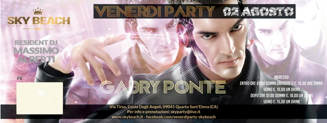 SPECIAL GUEST GABRY PONTE – SKY BEACH SARDINIA -VENERDI 2 AGOSTO 2013 Reviewed by admin on . Il primo evento dell'Agosto firmato Venerdì Party allo Sky beach!! 2 agosto ospite della serata in console Gabry Ponte dj. Ingresso donna omaggio o 10 € due dri Il primo evento dell'Agosto firmato Venerdì Party allo Sky beach!! 2 agosto ospite della serata in console Gabry Ponte dj. Ingresso donna omaggio o 10 € due dri Rating: