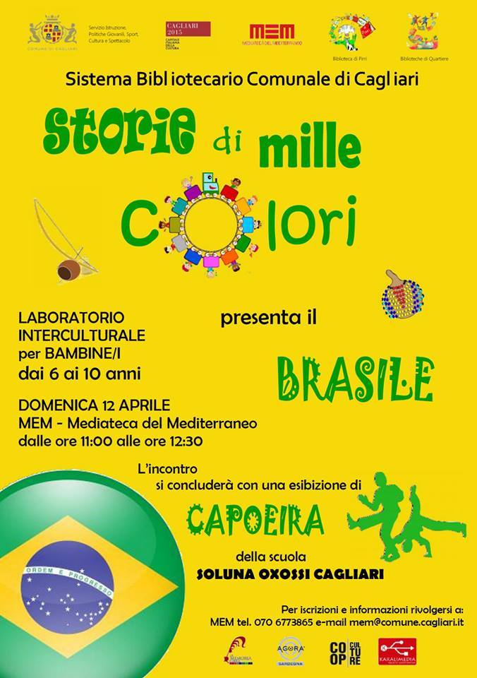 STORIE DI MILLE COLORI : BRASILE – MEM – CAGLIARI – DOMENICA 12 APRILE 2015 Reviewed by admin on . Domenica 12 aprile, dalle ore 11:00 alle ore 12:30, alla #MEM – Mediateca del Mediterraneo, le Biblioteche del Sistema Comunale di Cagliari (Mediateca del Medit Domenica 12 aprile, dalle ore 11:00 alle ore 12:30, alla #MEM – Mediateca del Mediterraneo, le Biblioteche del Sistema Comunale di Cagliari (Mediateca del Medit Rating: 0