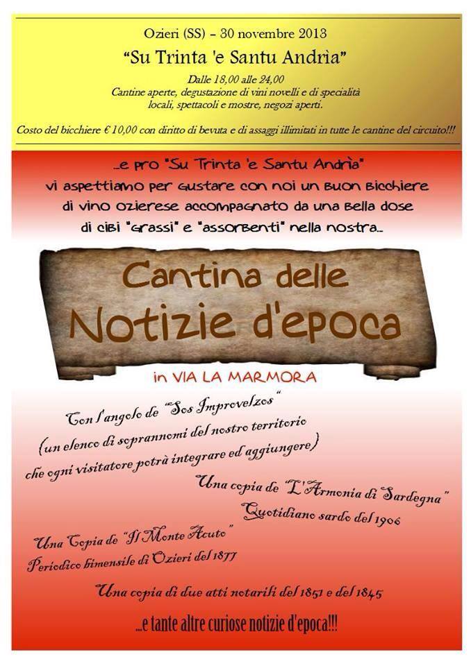 L’unica quota prevista è un costo di € 10,00 per l’acquisto del bicchiere in vetro che darà diritto a bere vino e mangiare illimitatamente in ogni cantina che si vorrà visitare. Il costo del bicchiere non si applica ai bambini e ai ragazzi al vostro seguito che potranno comunque mangiare e bere  nelle cantine.OZIERISUTRINTAOn Trinta ‘and Santu Andria – Saturday, November 30, 2013 – Ozieri