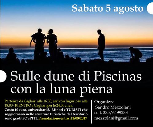 SULLE DUNE DI PISCINAS CON LA LUNA PIENA – SABATO 5 AGOSTO 2017 Reviewed by admin on . Una visita sulle dune piu' belle, con partenza da Cagliari alle 16,30 e rientro alle 24,00. Cena in spiaggia, magari anche con bagno. Costo 10 euro (5 per gli s Una visita sulle dune piu' belle, con partenza da Cagliari alle 16,30 e rientro alle 24,00. Cena in spiaggia, magari anche con bagno. Costo 10 euro (5 per gli s Rating: 0