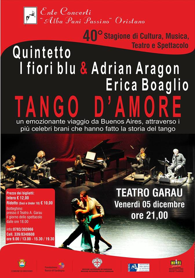 Venerdì 5 dicembre alle ore 21.00, presso il Teatro “A. Garau†di Oristano, l’ Ente Concerti “Alba Pani Passino†nella sua 40ª Stagione Concertistica 2014, ha il piacere di ospitare lo spettacolo Tango D’Amore con il Quintetto i Fiori Blu e direttamente da Buenos Aires, i ballerini Adrian Aragon e Erica Boaglio, reduci dal grande successo dello spettacolo “Pasiones Tango y Musical”.