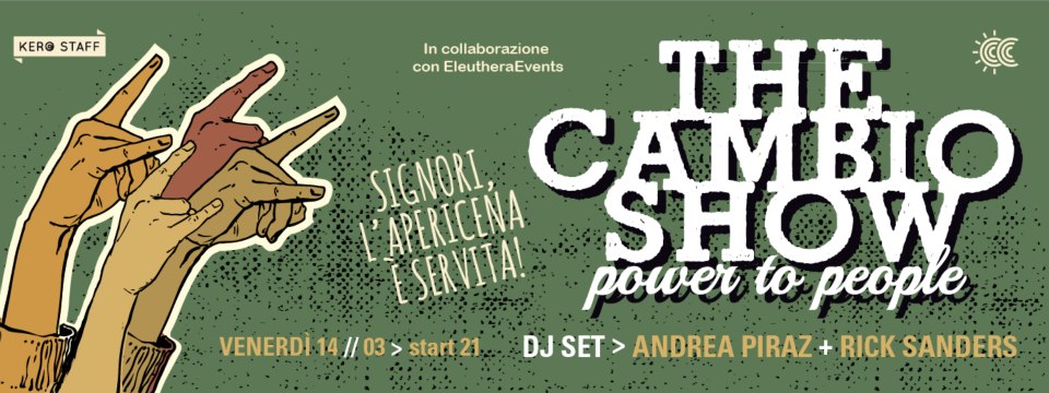 Eccoci pronti per un nuovo scintillante appuntamento del mese di Marzo, “THE CAMBIO SHOW – Power to People” ritorna la nostra inconfondibile Apericena Servita e per l’occasione e proprio per l’Happy Hour iniziamo una nuova collaborazione con i ragazzi del Eleuthera Events
