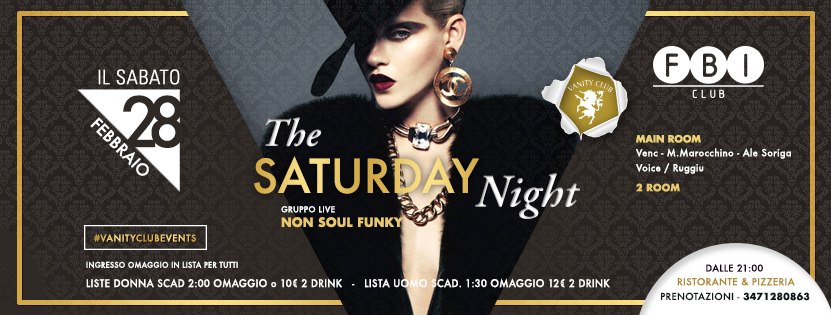 Il Saturday Night è una serata creata dal nostro gruppo organizzativo VANITY CLUB per un pubblico esigente che desidera trascorrere una serata piacevole.