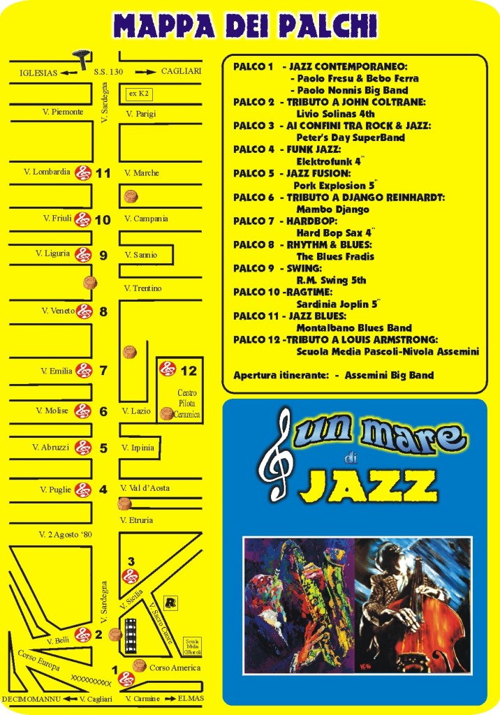 The year 2014 will be “A SEA OF JAZZ” will be held at Asselby along the Via Sardegna Saturday, June 14, 2014. There are 12 separate stages for styles: Swing, Ragtime, Jazz manouche, Bebop, Free Jazz, Jazz-Funk, Jazz Fusion, and again: Tribute to Louis Armstrong Tribute to Django Reinhardt Tribute to John Coltrane, etc … The stage n. 1 will be reserved for large international artist Paolo Fresu, accompanied on guitar by Bebo Ferra.