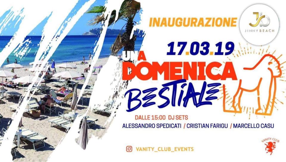 UNA DOMENICA BESTIALE – JINNY BEACH – QUARTU SANT’ELENA – DOMENICA 17 MARZO 2019 Reviewed by admin on . >DOMENICA 17 Marzo •••• INAUGURAZIONE •••• Siamo felicissimi d’invitarvi, al JINNY Beach per l’inaugurazione del nostro nuovo format: “Una DOMENICA bestiale” >DOMENICA 17 Marzo •••• INAUGURAZIONE •••• Siamo felicissimi d’invitarvi, al JINNY Beach per l’inaugurazione del nostro nuovo format: “Una DOMENICA bestiale” Rating: 0