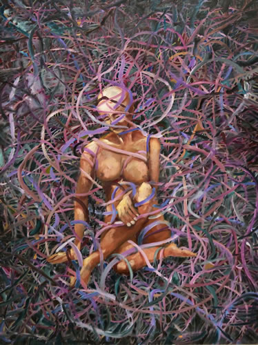 A world apart, almost like a split personality, is what occurs in raving & Aphorisms. The figure, when present, appears from a tangle of impenetrable thoughts, words are always an achievement of the eye. Demonstrating mastery of the various expressive techniques, Luciano Fele is proposed to a mature audience, and eager for novelty. (S. Von Wasser)