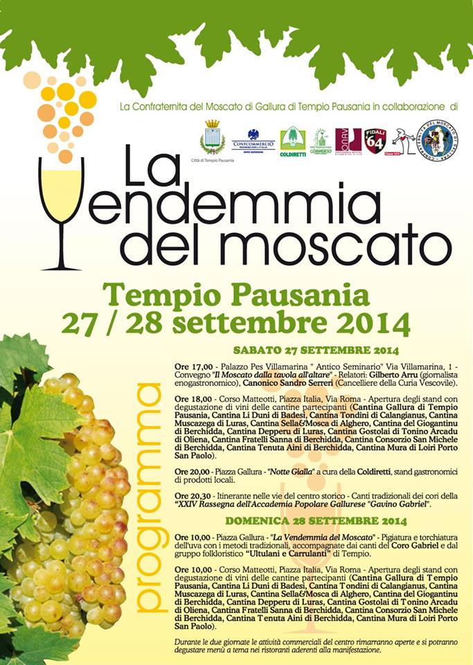 La Confraternita del Moscato di Gallura organizza, nel rispetto degli antichi metodi tradizionali di lavorazione, la prima edizione de “La Vendemmia del Moscato”, nelle giornate 27 e 28 settembre 2014, per rievocare gli usi tipici della “bibbenna gaddhuresa”.