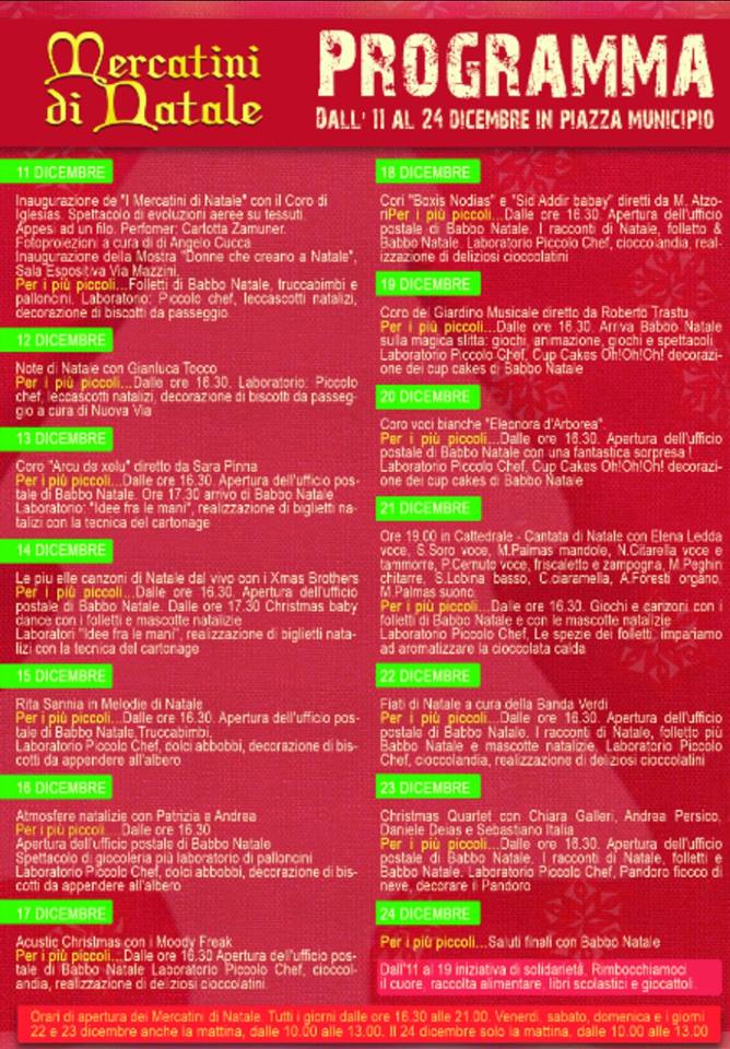 IL VILLAGGIO DI BABBO NATALE – IGLESIAS- 7-8-13-14-20-21-22 DICEMBRE 2014 Reviewed by admin on . Anche quest'anno Iglesias e la sua piazza Quintino Sella indossano l'abito natalizio e ospitano il Villaggio di Babbo Natale. I giorni di apertura sono 7-8 ; 13 Anche quest'anno Iglesias e la sua piazza Quintino Sella indossano l'abito natalizio e ospitano il Villaggio di Babbo Natale. I giorni di apertura sono 7-8 ; 13 Rating: 0