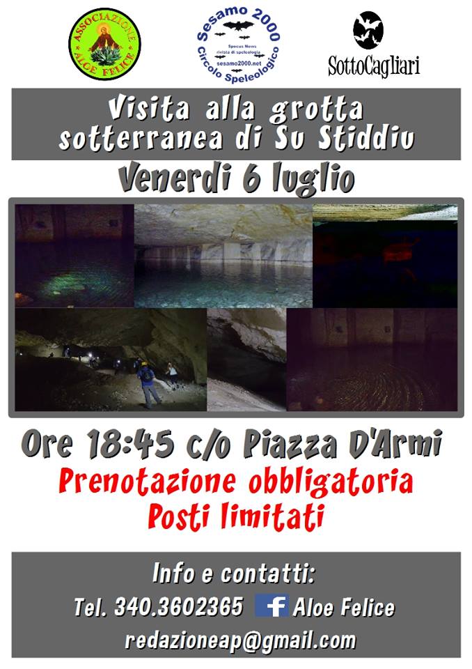 stiddiuL’associazione Aloe Felice e la pagina fb,, in collaborazione con il circolo speleologico Sesamo 2.000, e la pagina fb, SottoCagliari, organizza una visita alla scoperta della meraviglia sotterranea di Su Stiddiu.