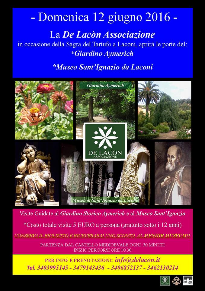 Domenica 12 giugno 2016, in occasione della Sagra del tartufo a Laconi, ci sarà la possibilità di visitare il Giardino Storico Aymerich e il Museo Sant’Ignazio. Venite a trovarci al nostro info-presso il castello medievale.