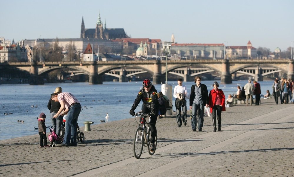 Nella città ci sono ben 185 chilometri di piste ciclabili, appositamente indicate con segnaletiche gialle, e numerosi parchi pubblici dove circolare con assoluta libertà e raggiungere le principali attrazioni turistiche. Ma è soprattutto fuori dal centro storico che si ritrovano delle stradine ciclabili libere dal traffico che attraversano la campagna praghese per farvi assaporare la bellezza dei paesaggi naturali, degli itinerari alla scoperta di angoli della città meno conosciuti o semplicemente frequentati dai residenti.