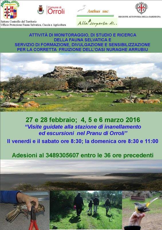 Nell’ambito del Progetto ” ATTIVITÀ DI MONITORAGGIO, DI STUDIO E RICERCA DELLA FAUNA SELVATICA E SERVIZIO DI FORMAZIONE, DIVULGAZIONE E SENSIBILIZZAZIONE PER LA CORRETTA FRUIZIONE DELL’OASI NURAGHE ARRUBIU”, il 27 e 28 Febbraio; 4, 5 e 6 Marzo 2016 sarà possibile partecipare alle visite guidate presso la Stazione di inanellamento degli uccelli selvatici ad escursioni sul Prano di Orroli.
