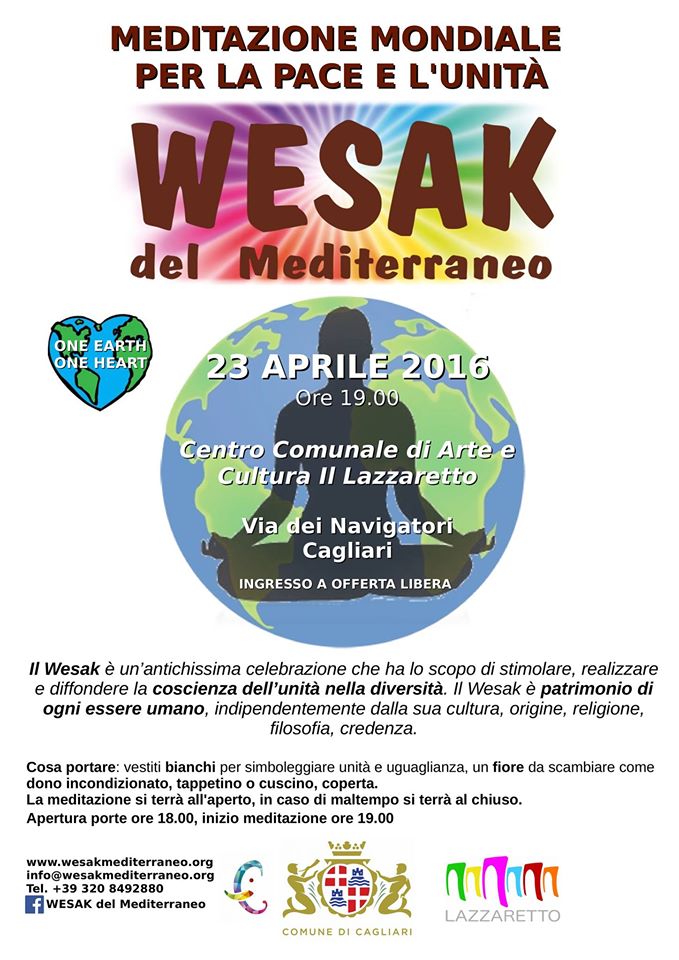 WESAK DEL MEDITERRANEO – LAZZARETTO – CAGLIARI – SABATO 23 APRILE 2016 Reviewed by admin on . WESAK DEL MEDITERRANEO 2016 - MEDITAZIONE MONDIALE PER LA PACE E L'UNITÀ Il 23 Aprile 2016 si terrà la terza edizione del Wesak del Mediterraneo, meditazione mo WESAK DEL MEDITERRANEO 2016 - MEDITAZIONE MONDIALE PER LA PACE E L'UNITÀ Il 23 Aprile 2016 si terrà la terza edizione del Wesak del Mediterraneo, meditazione mo Rating: 0