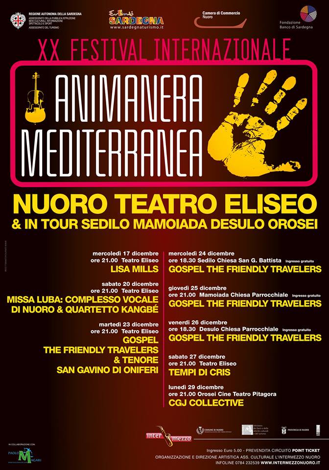 Il concerto del Complesso Vocale di Nuoro, sabato 20, ha ottemperato al ruolo propizio auspicato da quanti hanno voluto assistere a questo secondo evento per le kermesse Animanera Mediterranea. Nuovi e lieti scorci si affacciano per accogliere nella maniera più adeguata le festività e martedì 23 dicembre, alle 21,00 il Teatro Eliseo di Nuoro concede il palco al quartetto gospel The Friendly Travelers, in questa serata insieme ai Tenore San Gavino Oniferi, un’occasione per segnare l’inizio del tour che proseguirà nei giorni successivi e toccherà le località di Sedilo (chiesa di S.Giovanni Battista) la vigilia alle 18,30; il giorno di Natale a Mamoiada (Chiesa Parrocchiale) ore 21,00 e infine a Desulo il 26 dicembre (Chiesa Parrocchiale) sempre allo stesso orario.
